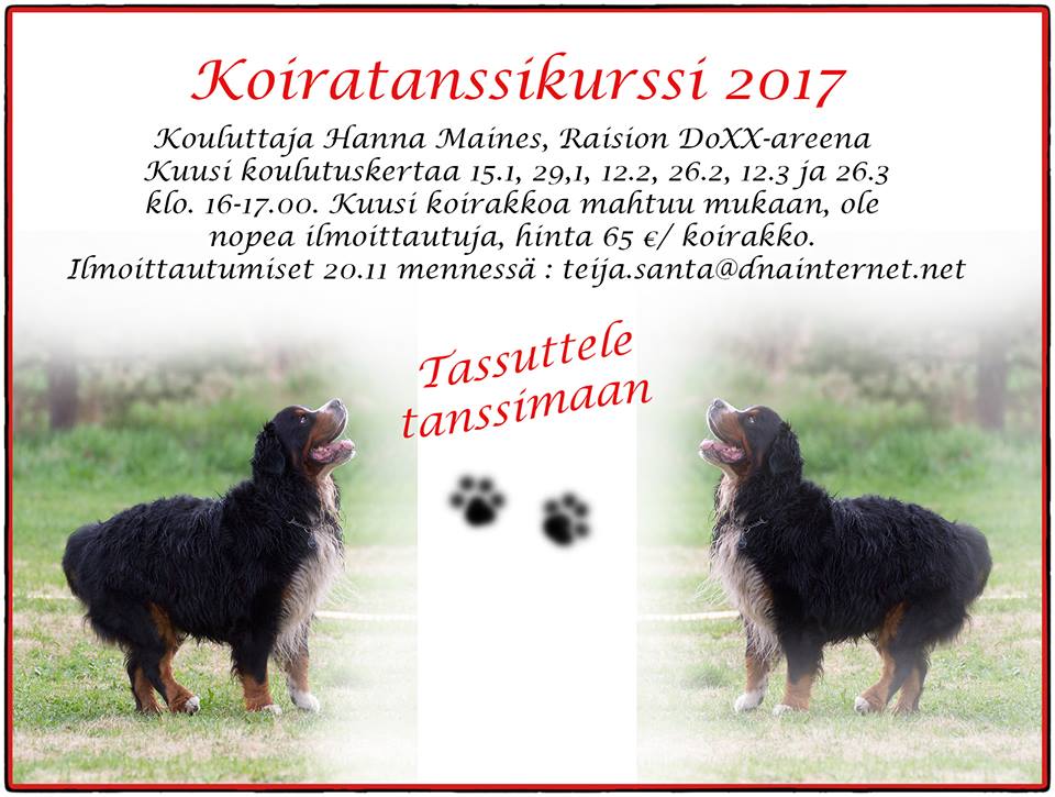 - Koiratanssin alkeiskurssi alkuvuonna 2017. Kouluttaja Hanna Maines, paikka DoXX-areena Raisiossa. Lue lisää täältä.