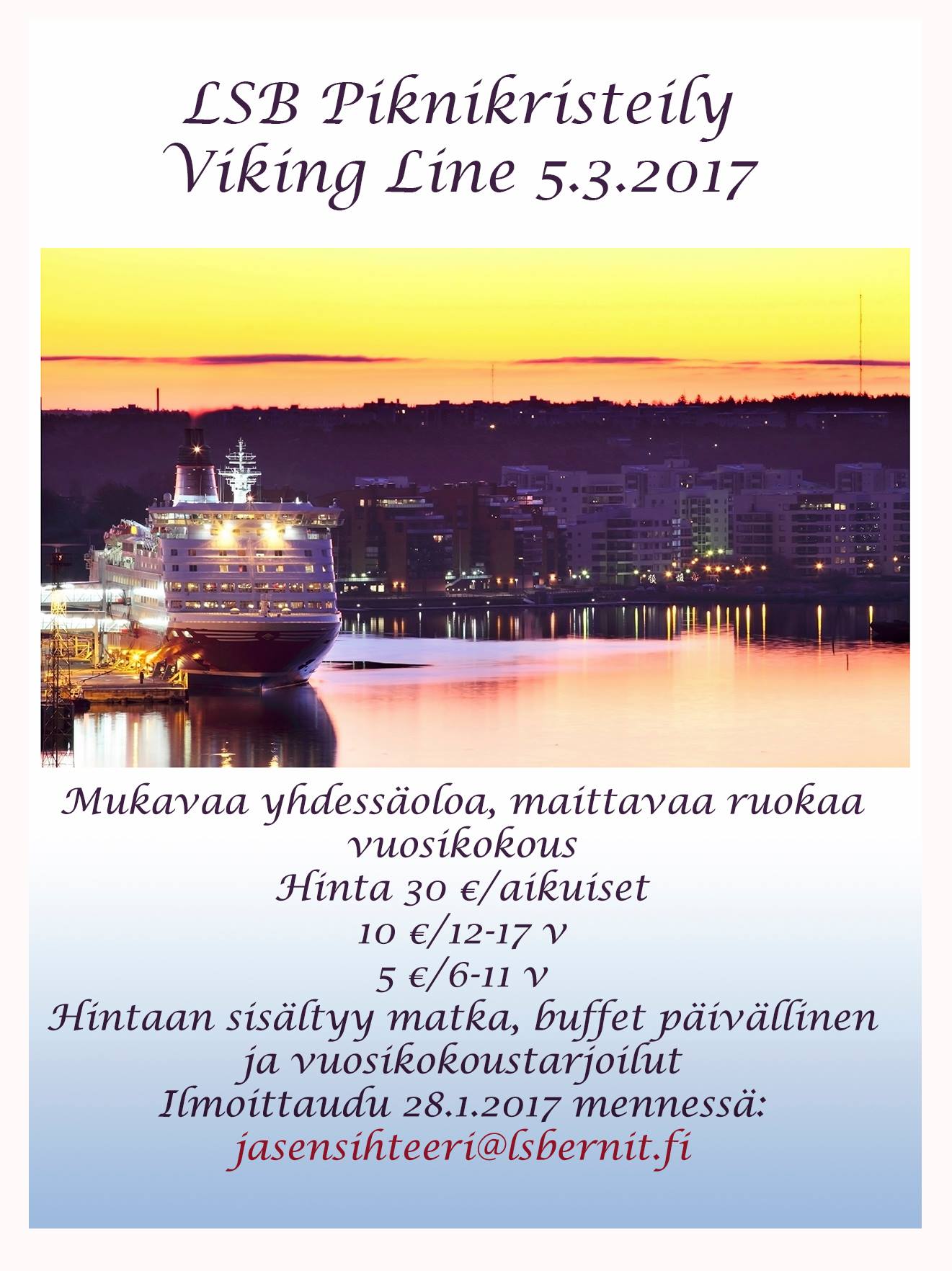 - LSB:läisten yhteinen Piknik-risteily ja vuosikokous 5.3.2017. Löydät täältä mainoksen ja vuosikokouskutsun. TERVETULOA MUKAAN!